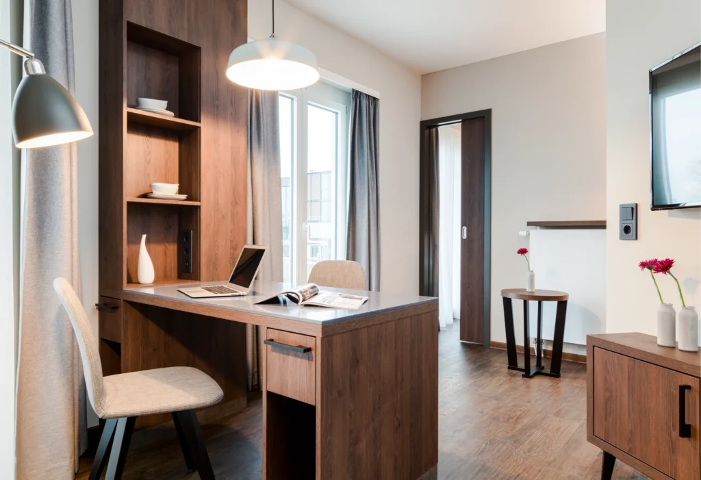 Studio-Apartment mit Küchenzeile, separatem Wohnbereich und Schlafzimmer, Balkon oder Terrasse. Perfekt für längere Aufenthalte.